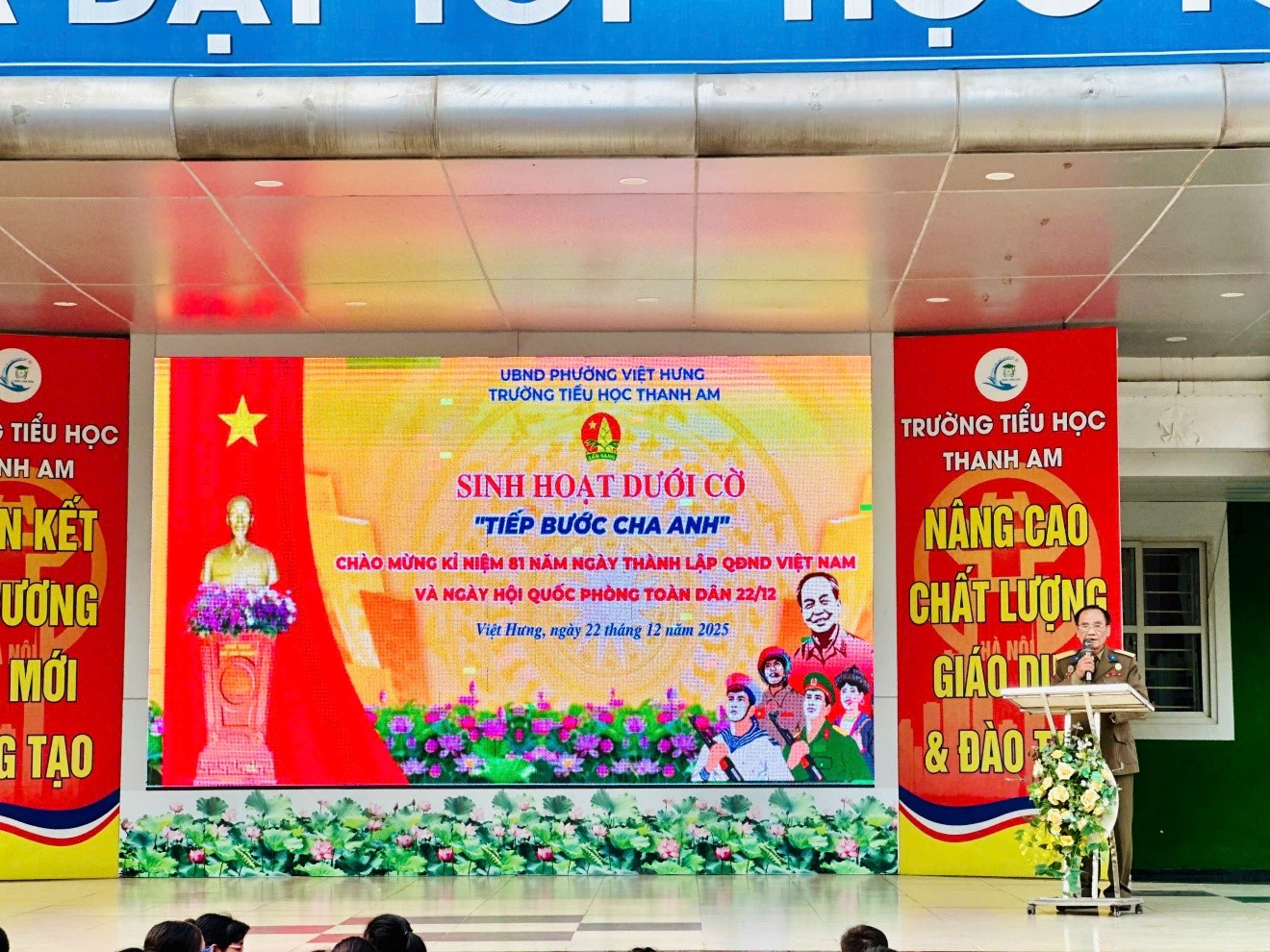Sáng thứ hai vừa qua, sân trường Tiểu học Thanh Am như được nhuộm thắm bởi sắc đỏ của màu cờ và sự hào hứng trên gương mặt của hơn 900 học sinh. Trong không khí trang nghiêm của tiết chào cờ đầu tuần, thầy và trò nhà trường đã cùng nhau ôn lại chặng đường vẻ vang của Quân đội Nhân dân Việt Nam anh hùng – những “anh bộ đội Cụ Hồ” đã dâng hiến thanh xuân cho độc lập, tự do của Tổ quốc.