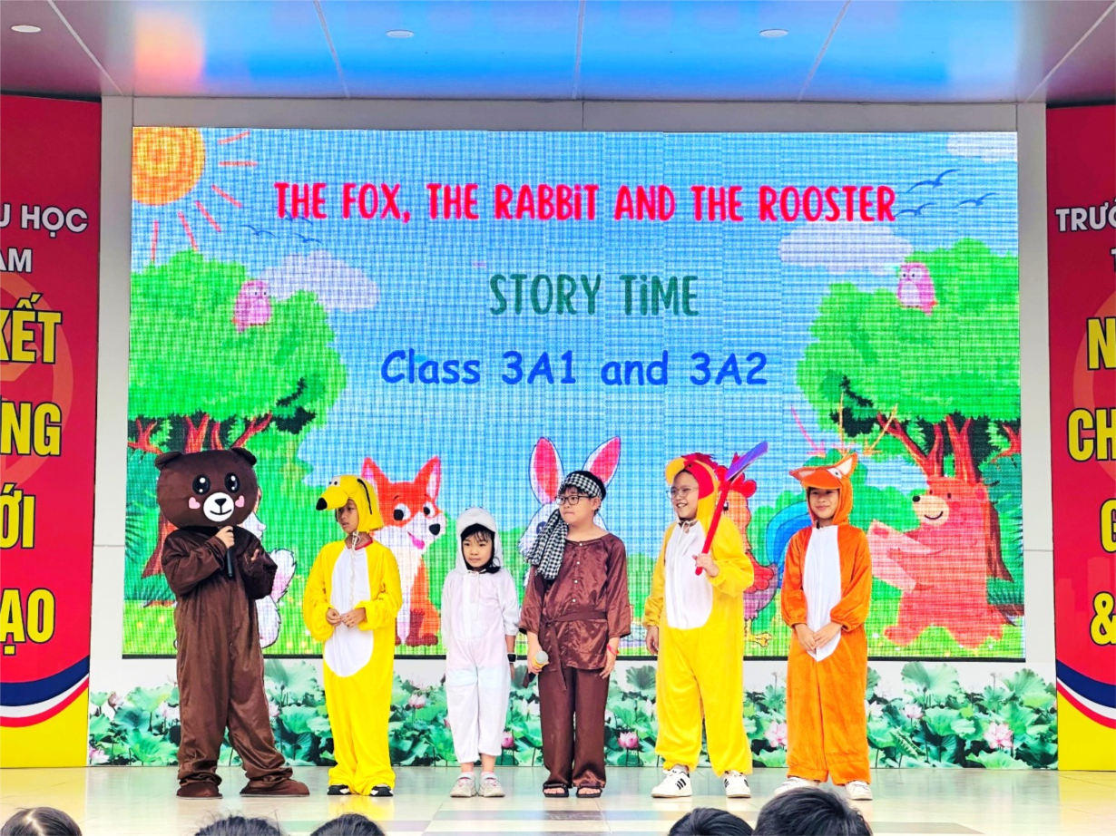 Tại đây các bạn học sinh lớp 3 đã được thể hiện khả năng sắm vai, diễn kịch và thuyết trình câu chuyện bằng tiếng Anh. Sau mỗi tiết mục, các bạn nhỏ lại vỡ òa trong niềm vui sướng cùng những lời chúc mừng đầy dí dỏm của thầy cô. Rất mong các em em sẽ tiếp tục phát huy những sở trường của bản thân & phát triển khả năng sáng tạo trong những năm học tiếp theo.