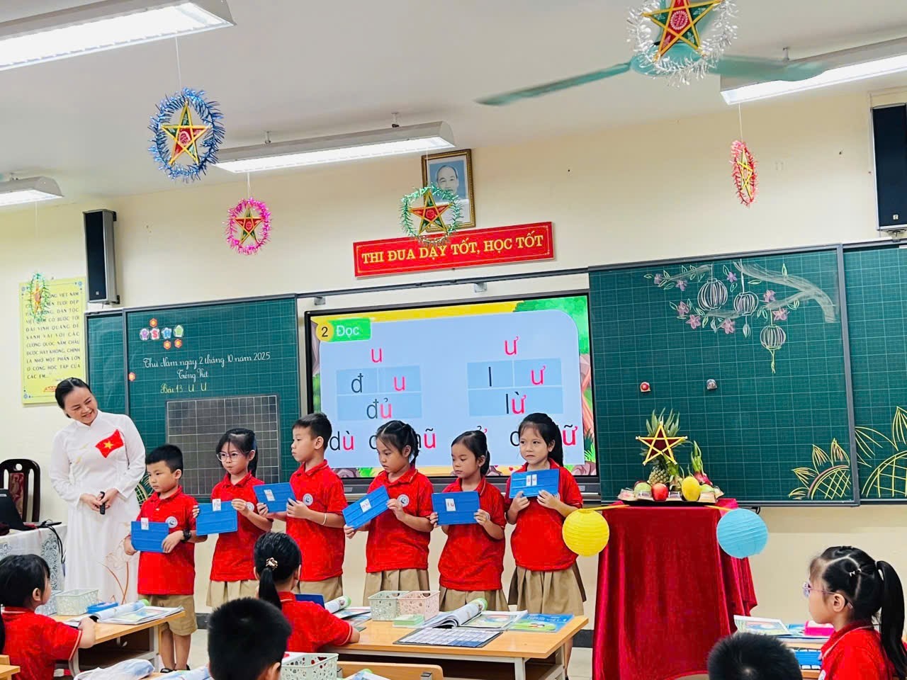 Khoảnh khắc cuối tiết học, khi các con đã thu thập đủ 4 huy hiệu và dùng chính những chữ cái, từ ngữ vừa học để trang trí mâm cỗ Trung Thu đã mang lại niềm vui chiến thắng và ý nghĩa sâu sắc. Tất cả học sinh lớp 1A1 đã hoàn thành xuất sắc nhiệm vụ và chính thức được tuyên dương là "Chiến binh khám phá chữ Việt"!