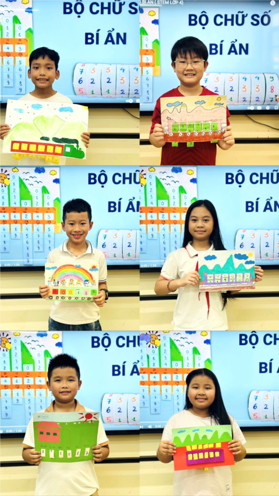 Trong tiết học : SỐ CÓ SÁU CHỮ SỐ - SỐ 1 000 000 TIẾT 2 có ứng dụng STEM với nội dung "bộ chữ số bí ẩn", các em học sinh lớp 4A1 được yêu cầu tạo ra một công cụ học tập giúp các con nắm vững và hiểu sâu hơn về cấu tạo số và có thể lập được vô vàn các số có sáu chữ số khác nhau. Công nghệ được tích hợp vào đây khi các em học sinh có thể sử dụng các vật liệu đơn giản, dễ kiếm, dễ tìm như: cố giấy, bìa màu, băng dính, giấy bìa cát tông, hồ dán, …để làm ra bộ chữ số của mình. Điều này không chỉ giúp các em làm quen với công nghệ mà còn phát triển kỹ năng khéo léo, cẩn thận, một kỹ năng quan trọng rất cần cho mỗi con người.