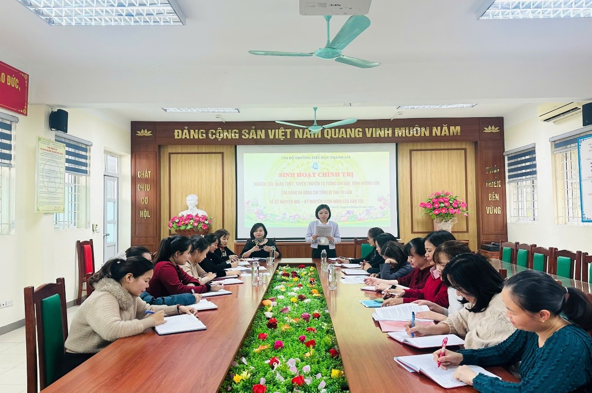 Trong bối cảnh thế giới đang thay đổi từng ngày, đất nước ta đang bước vào một Kỷ nguyên mới – Kỷ nguyên hội nhập và phát triển mạnh mẽ, với khát vọng dân tộc vươn tầm cao mới. Để thực hiện hóa mục tiêu xây dựng một Việt Nam hùng cường, thịnh vượng. Đồng chí Tổng Bí thư Tô Lâm khẳng định: “Với thế và lực đã tích lũy được sau 40 năm đổi mới, với sự đồng lòng, chung sức của toàn Đảng, toàn dân và toàn quân, với những thời cơ, thuận lợi mới, dưới sự lãnh đạo sáng suốt của Đảng, chúng ta đã hội tụ đủ những điều kiện cần thiết đưa đất nước bước vào Kỷ nguyên mới - Kỷ nguyên vươn mình của dân tộc Việt Nam”. Định hướng về một kỷ nguyên mới, thể hiện tầm nhìn, tư duy, quan điểm, phương hướng, định hình chiến lược mới của Đảng ta, người đứng đầu Đảng ta trước những chuyển động mạnh mẽ của thời đại. Đây là bước đổi mới của Đảng, cũng là một cột mốc quan trọng trong tiến trình dựng nước và giữ nước của dân tộc. Chi Bộ trường Tiểu học Thanh Am đã nhận thức sâu sắc vai trò của mình trong công việc đóng góp vào sự nghiệp chung, bắt đầu từ công việc sinh hoạt chi bộ tại cơ sở theo từng tháng.
