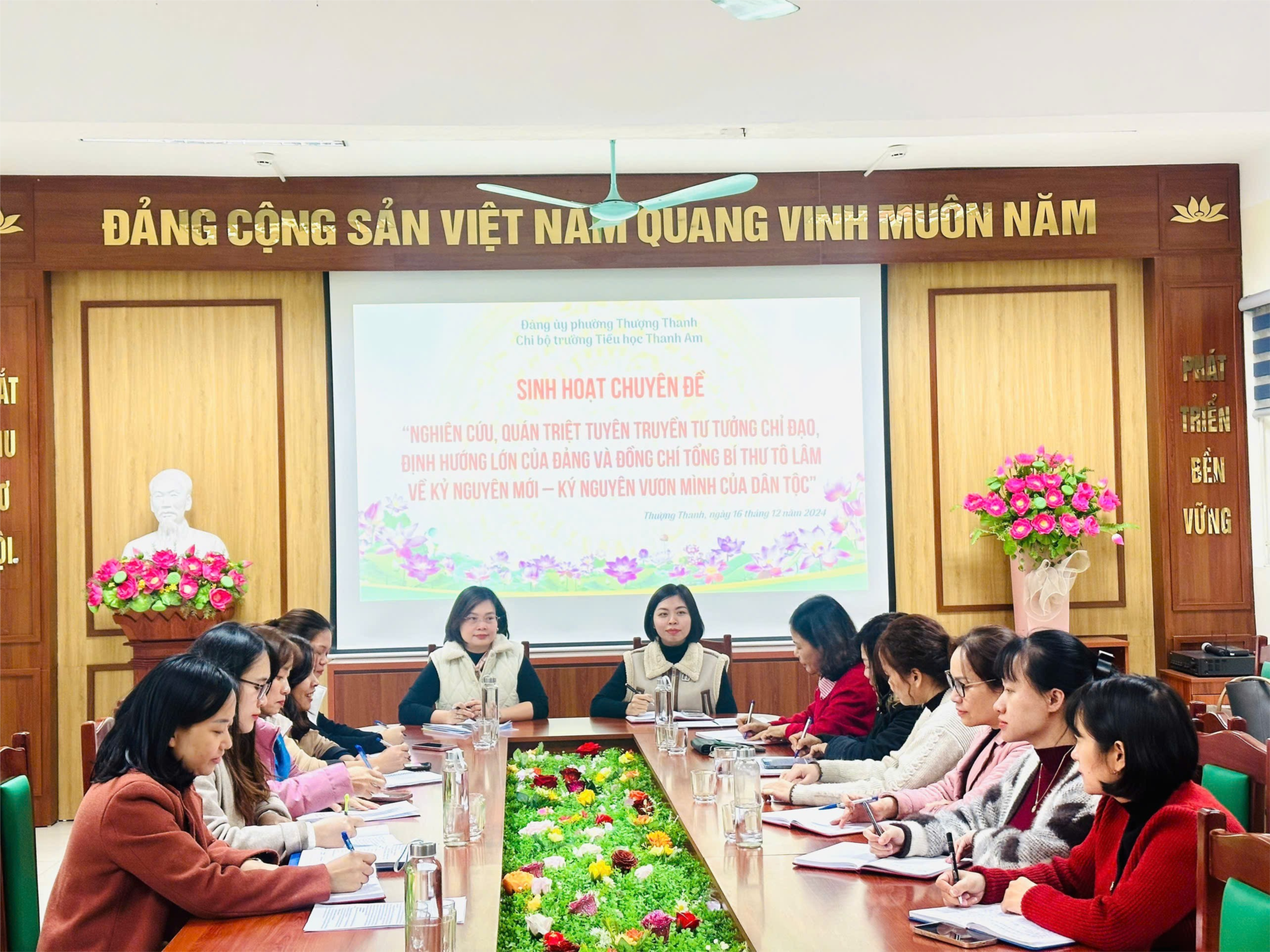 Chiều ngày 16/12/2024, Chi bộ trường Tiểu học Thanh Am tổ chức buổi sinh hoạt chính trị theo Kế hoạch số 266-KH/QU, ngày 10/12/2024 của Quận ủy Long Biên triển khai đợt sinh hoạt chính trị: “Nghiên cứu, quán triệt, tuyên truyền tư tưởng chỉ đạo, định hướng lớn của Đảng và đồng chí Tổng Bí thư Tô Lâm về kỷ nguyên mới - kỷ nguyên vươn mình của dân tộc”;