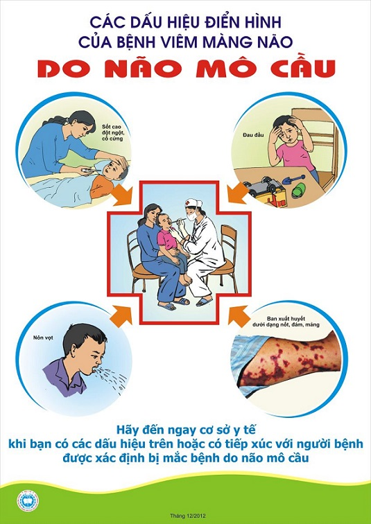 * Triệu chứng của bệnh: Sốt, đau đầu, buồn nôn, nôn, gáy cứng, trẻ nhỏ có thóp phồng, lơ mơ, nhạy cảm với ánh sáng, có thể xuất hiện ban xuất huyết hình sao hoặc biểu hiện sốc nhiễm khuẩn…