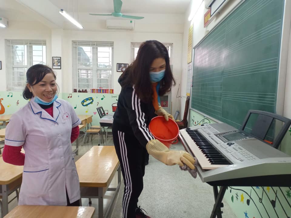 Từ sáng sớm, Ban giám hiệu, giáo viên, nhân viên trường Tiểu học Thanh Am đã có mặt, tích cực phối hợp với các nhân viên của Trạm Y tế Phường Thượng Thanh thực hiện tổng vệ sinh, phun thuốc khử trùng. Các khu vực được phun thuốc khử trùng bao gồm phòng học, phòng làm việc, phòng chức năng, hành lang, bếp ăn, khu vệ sinh. Nền nhà, bàn ghế, tay nắm cửa... được lau bằng chất tẩy rửa chuyên dụng.