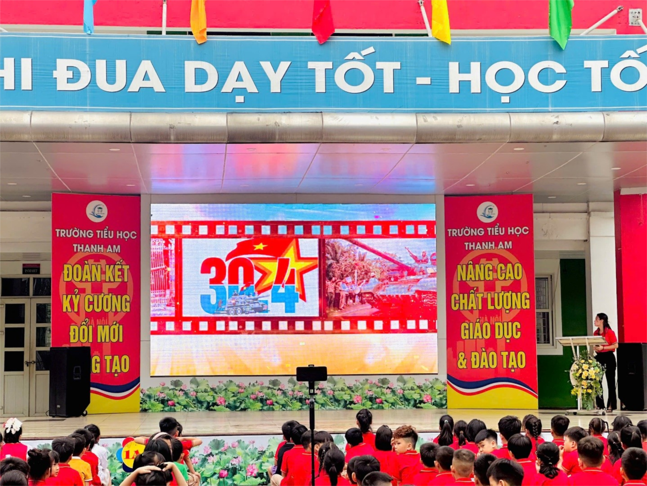 Ngay từ đầu tháng 4, nhà trường đã phát động đợt sinh hoạt chủ điểm “Uống nước nhớ nguồn - Tiếp bước cha anh” với chuỗi hoạt động đa dạng, phong phú. Trong các buổi lễ chào cờ đầu tuần, học sinh đã được nghe chuyện lịch sử về Chiến dịch Hồ Chí Minh, những tấm gương anh hùng nhỏ tuổi trong kháng chiến, giúp các em hiểu thêm về ý nghĩa của ngày 30/4 lịch sử.