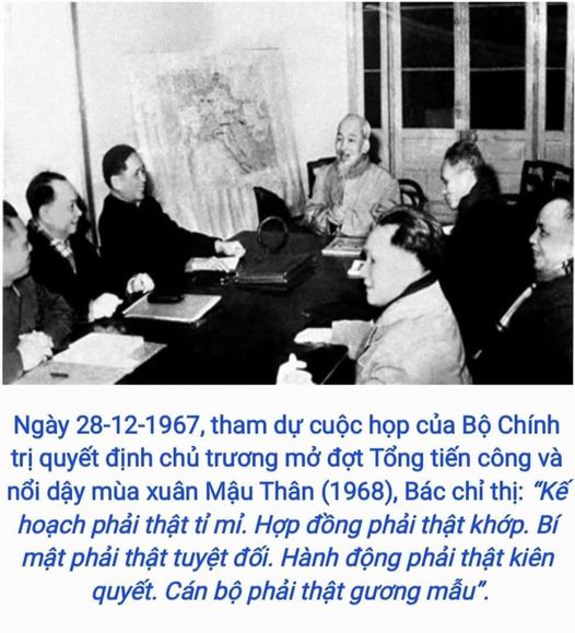 Ngày 28-12-1967, tham dự cuộc họp của Bộ Chính trị quyết định chủ trương mở đợt Tổng tiến công và nổi dậy mùa xuân Mậu Thân (1968), Bác chỉ thị: “Kế hoạch phải thật tỉ mỉ. Hợp đồng phải thật khớp. Bí mật phải thật tuyệt đối. Hành động phải thật kiên quyết. Cán bộ phải thật gương mẫu”./.