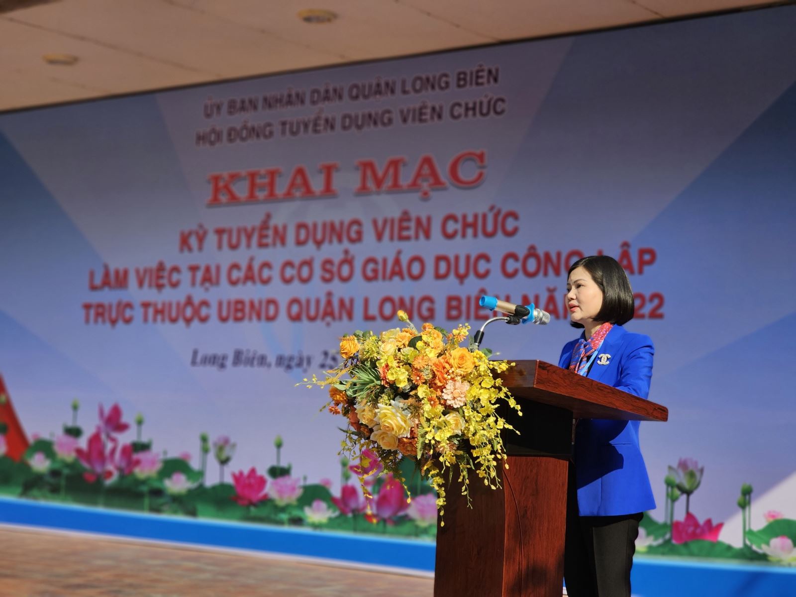 Tại buổi khai mạc, đồng chí !important; Đinh Thị Thu Hương - UVTV, Phó chủ tịch UBND quận, Chủ tịch Hội đồng tuyển dụng đã phát biểu khai mạc kỳ thi, đề nghị các đơn vị có liên quan phối hợp chặt chẽ thực hiện đúng nhiệm vụ, quyền hạn theo quy định, công tâm, khách quan, tuân thủ nội quy, quy chế thi và quy định của pháp luật trong thực hiện nhiệm vụ tuyển dụng viên chức. Đồng chí nhấn mạnh vai trò quan trọng của đội ngũ nhà giáo và chúc các bạn thí sinh nắm vững kiến thức, bình tĩnh tự tin, đạt điểm cao, vượt qua kỳ thi tuyển dụng để trở thành viên chức ngành giáo dục của quận Long Biên.